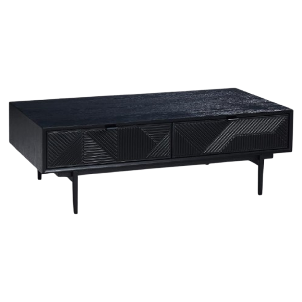This bold coffee table showcases sculpted geometric drawer panels and a minimalist metal base. Perfect for modern interiors, it provides concealed storage while adding a distinctive design element to the room.